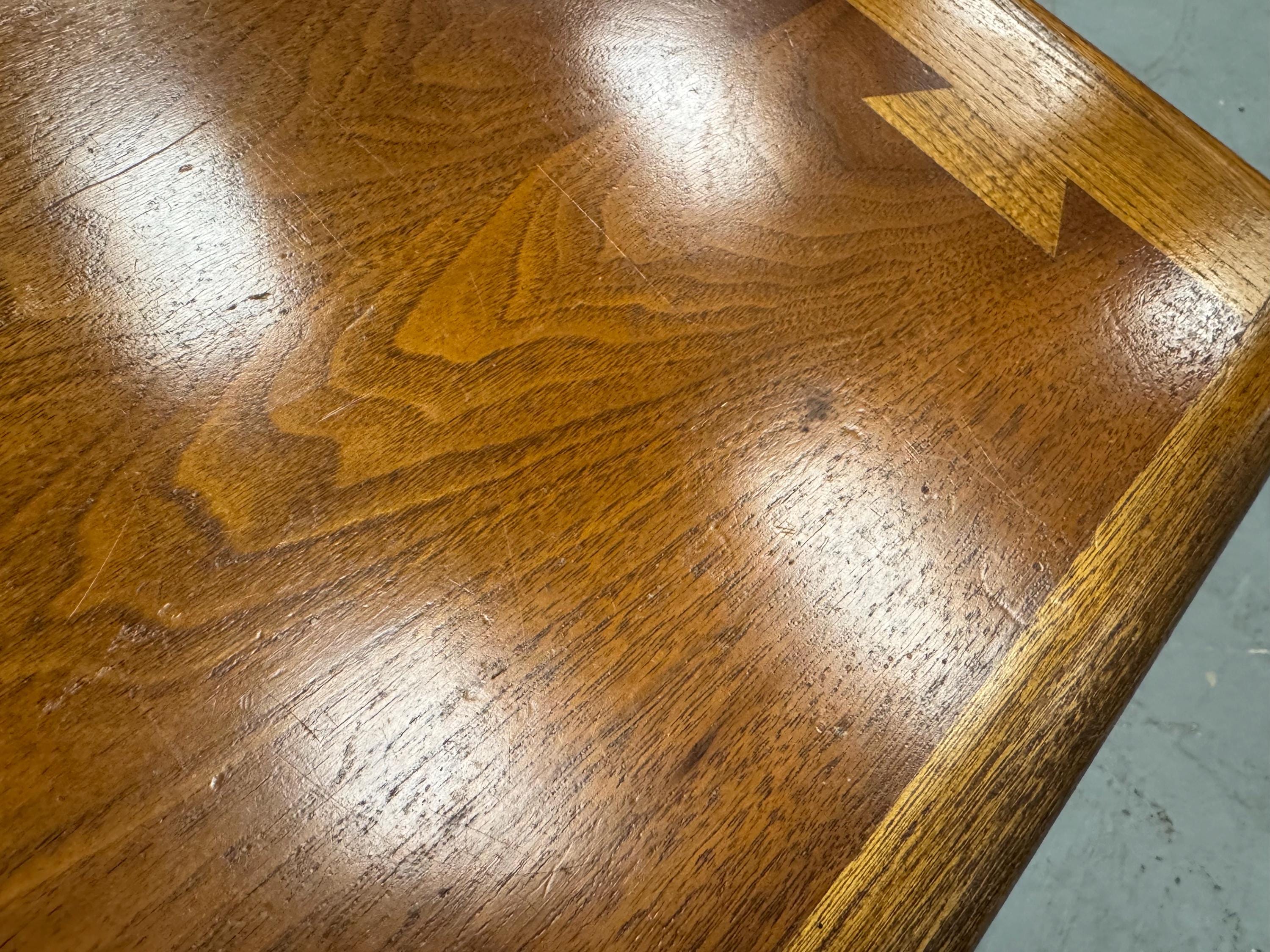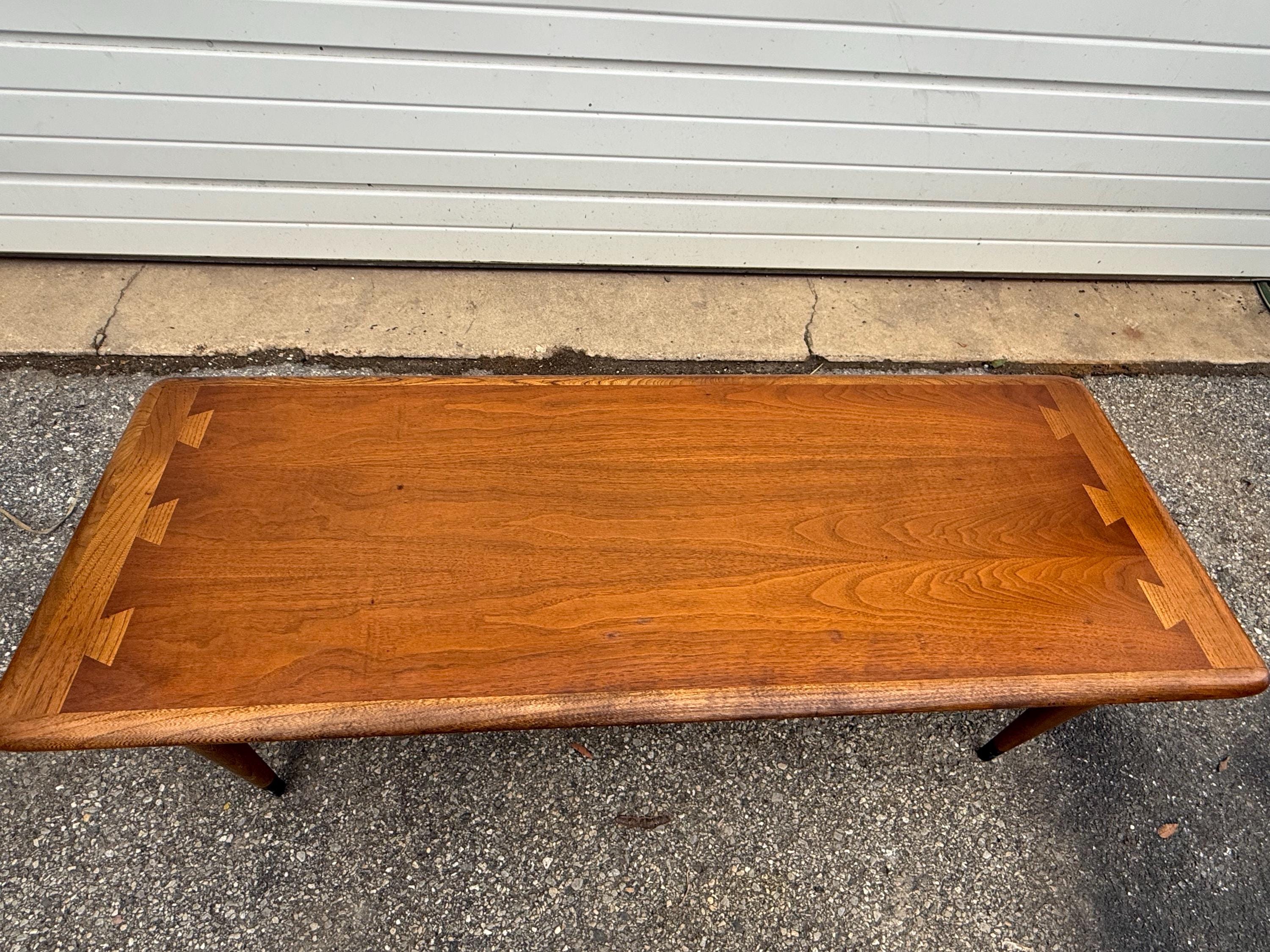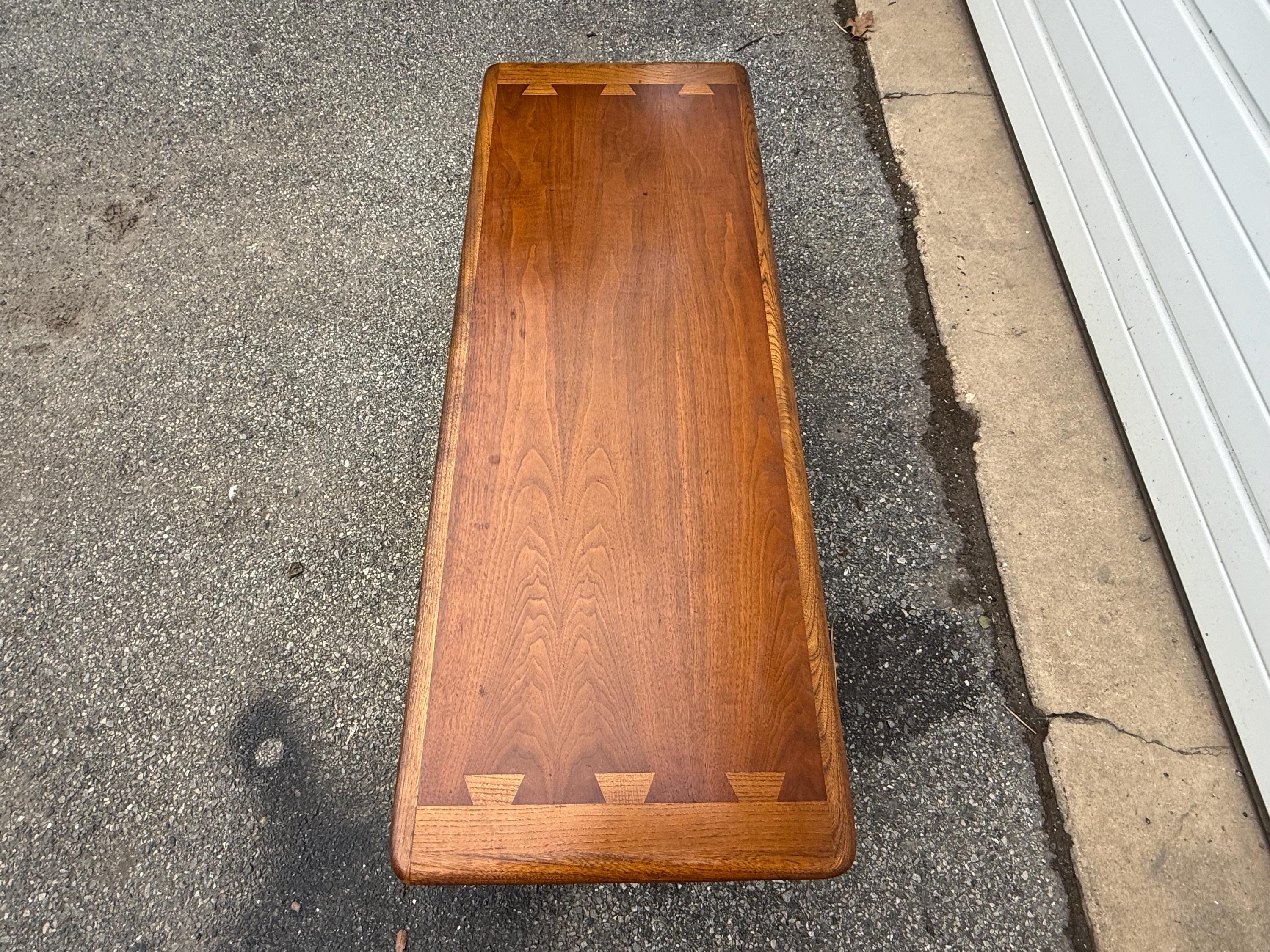 Offered is a great Mid-Century Danish Modern Andre Bus Lane Acclaim Elongated Coffee Table. It has an oak edge with a walnut top and walnut legs. A nice contour of the base will please any mid century lover. The top has been refinished and is ready for use. It is in good condition showing minor age wear (very minor scratches, refinished top, age wear on legs- see pictures). This table was designed by Andre Bus for Lane's 'Acclaim' series. A great set to add to your home. It is signed Lane . Check out our other listings for a matching coffee table and end tables, plus more Mid-Century Modern pieces, furniture, antiques and more!
