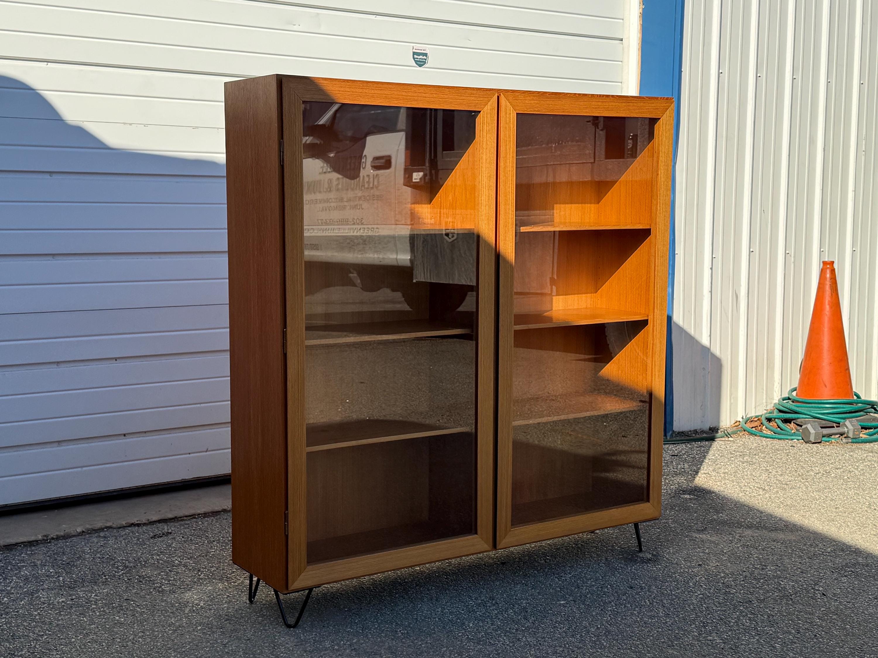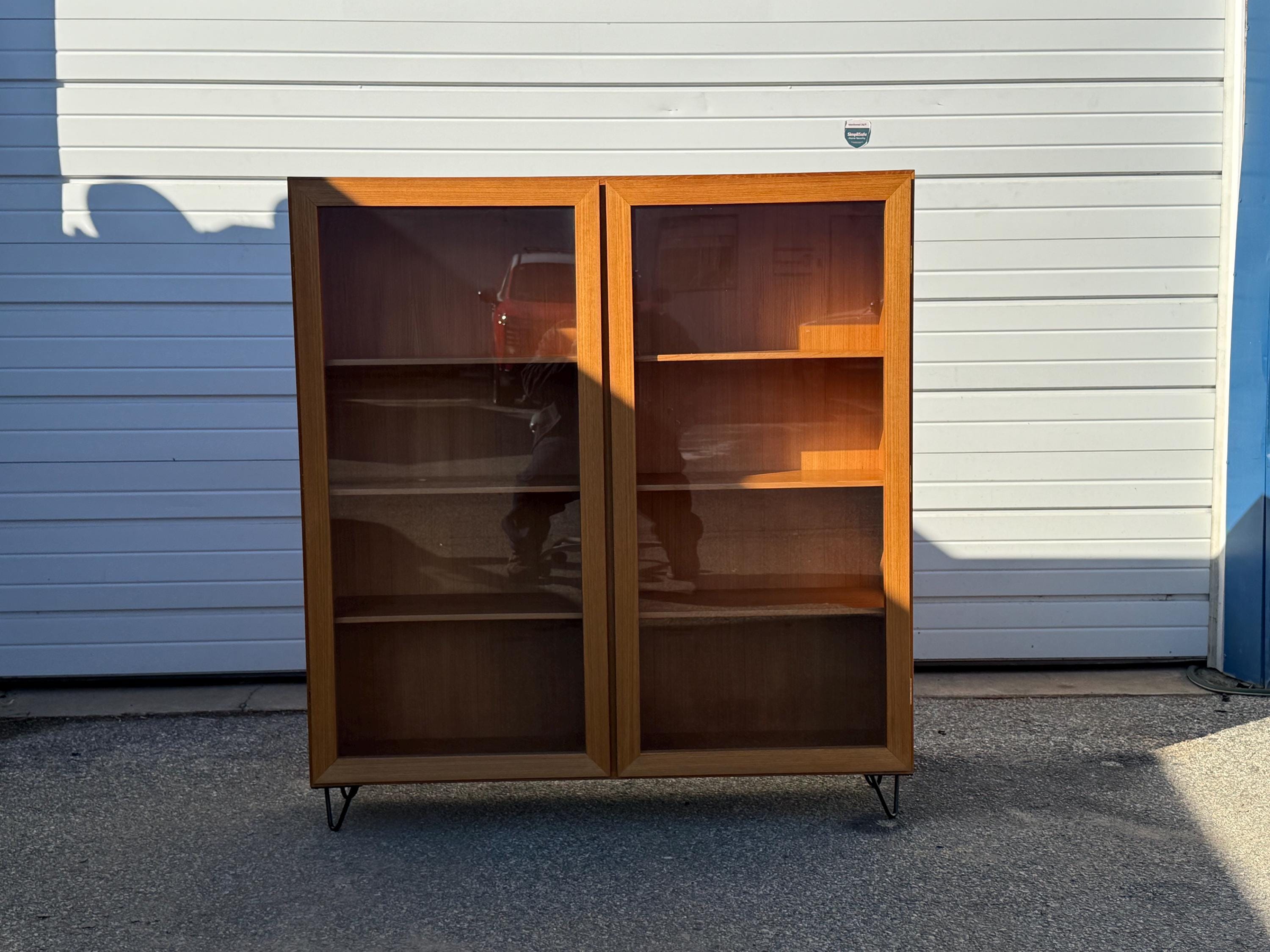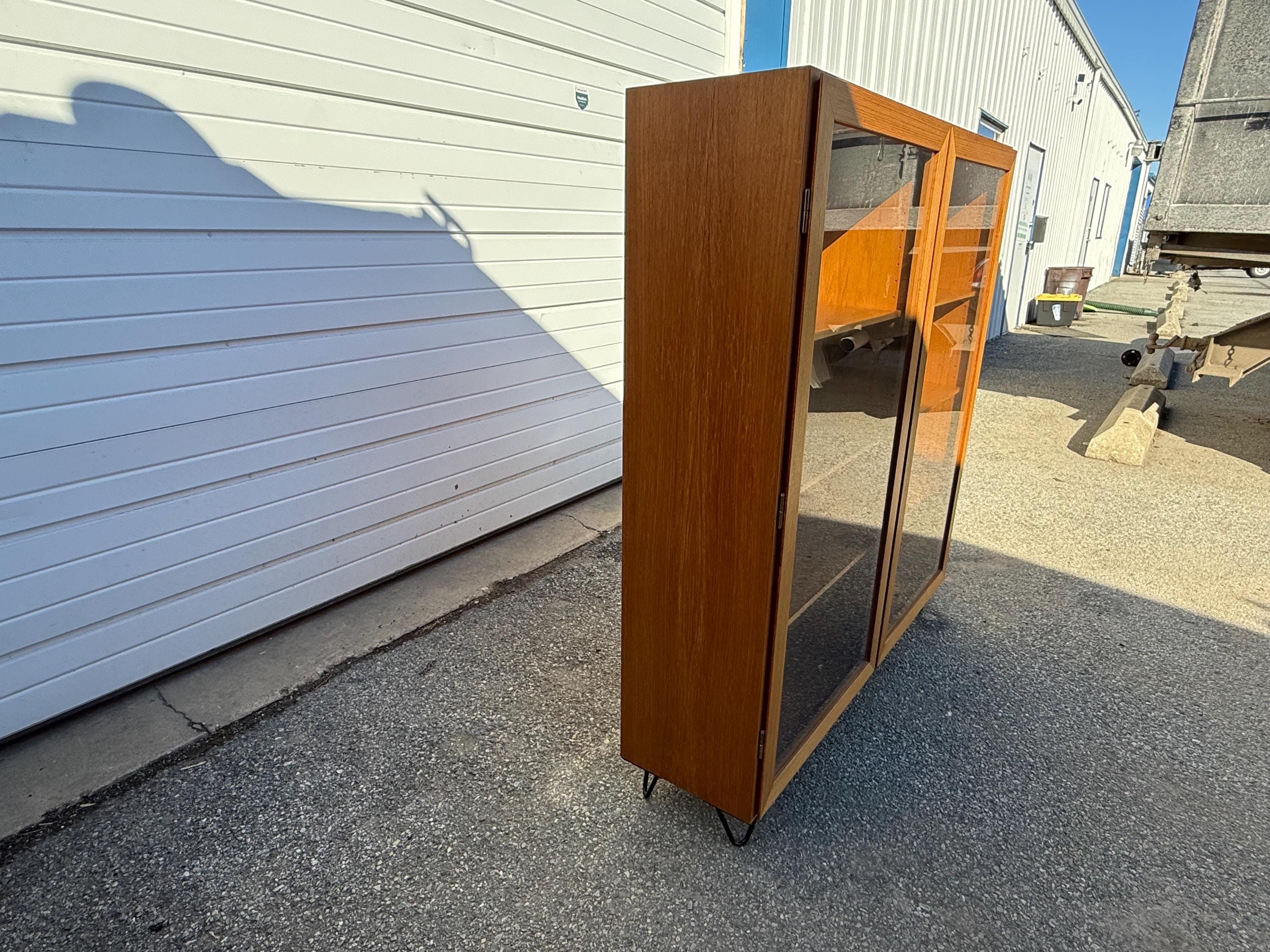 Offered is a Mid Century Danish Modern Teak 2 Door Bookcase. It has two separate shelving sections. It features two glass doors and each side has four shelves for efficiency. This is a highly versatile piece which offers ample storage and has great look. It is structurally sound with some minor fading and scratches in the wood. It has some age wear. It is made of teak wood. The bookcase is on hairpin legs. We have two units available. Review photos carefully and message us for additional info. It is not signed. See our other listings for more vintage finds!