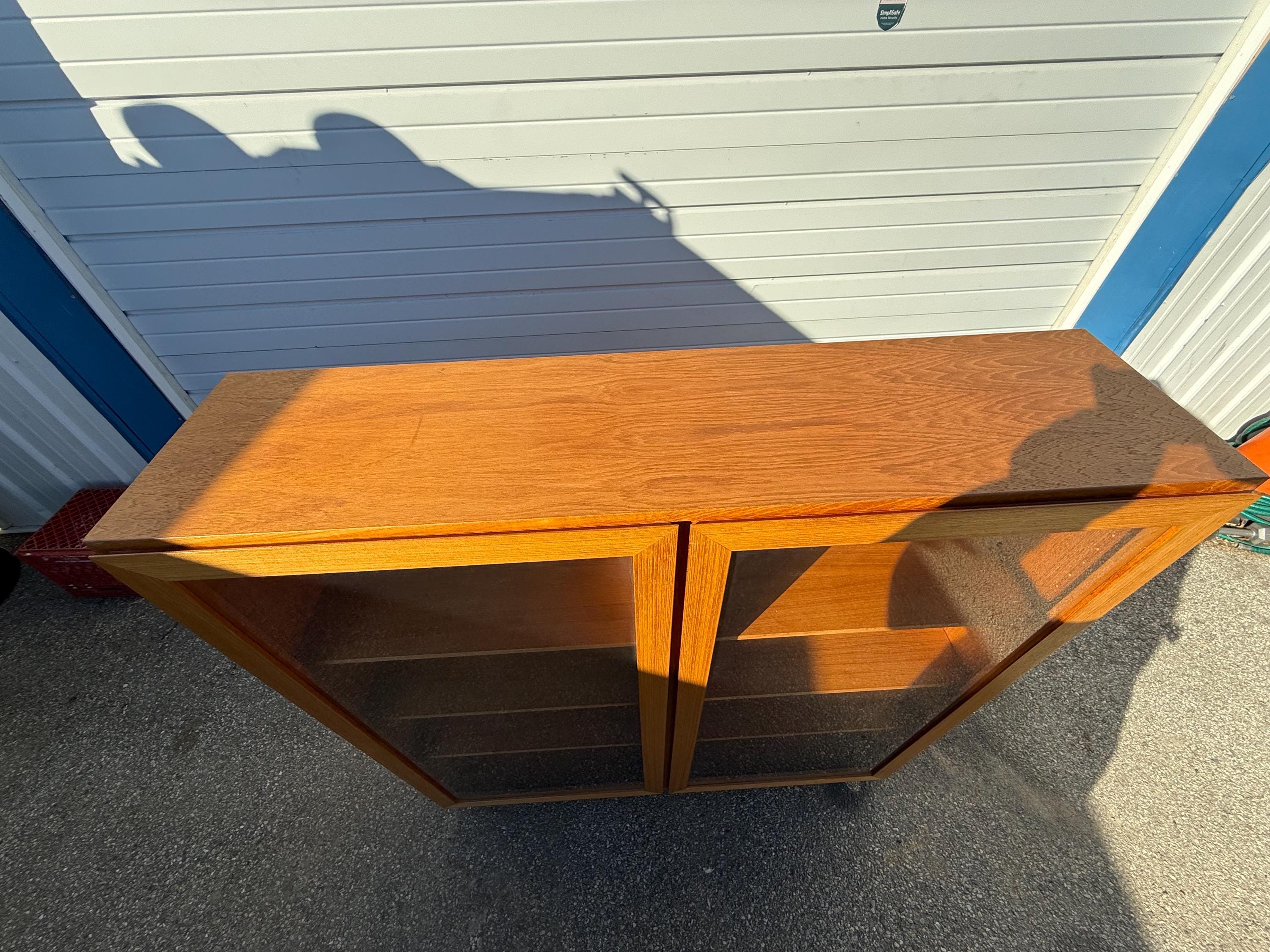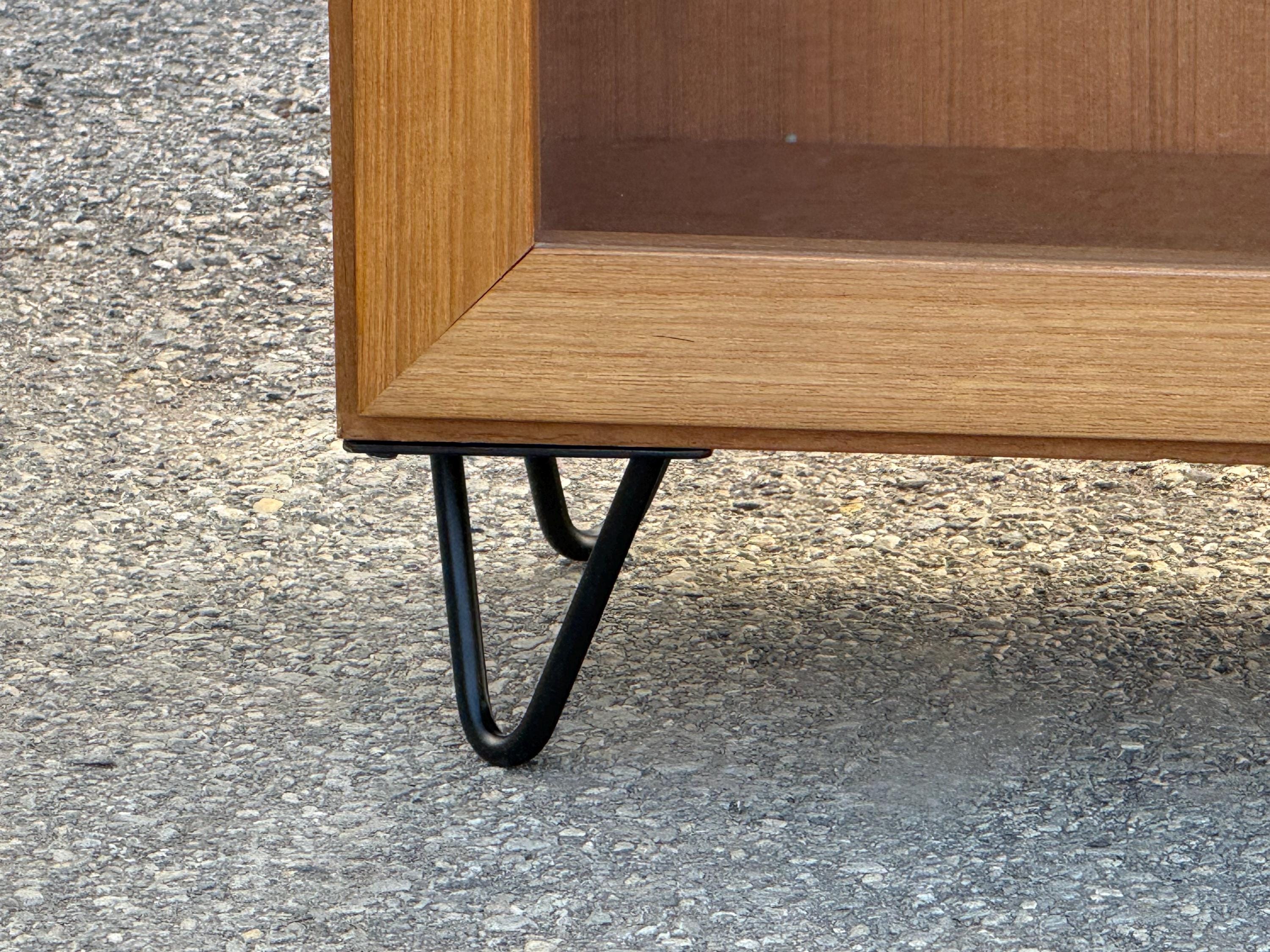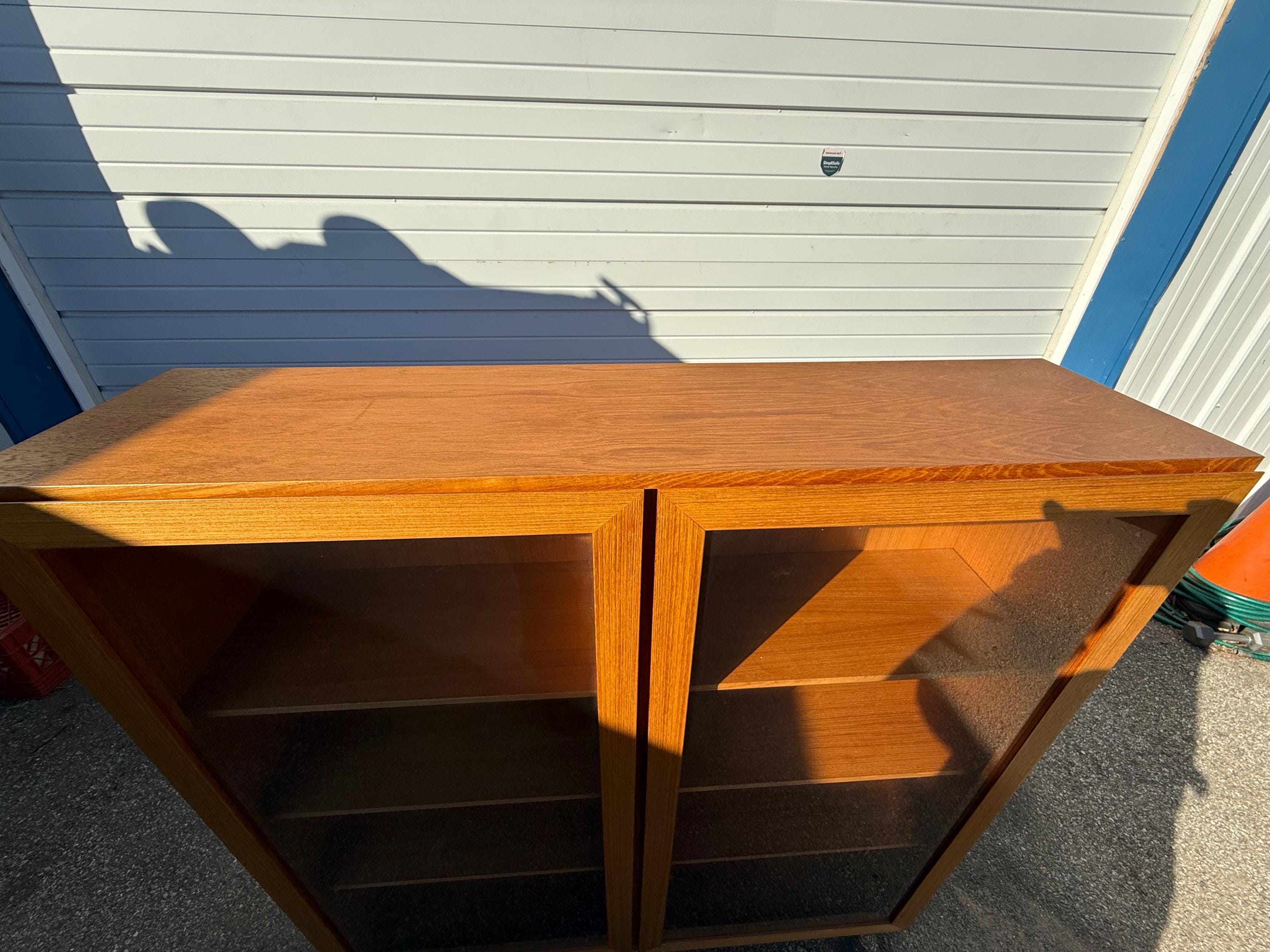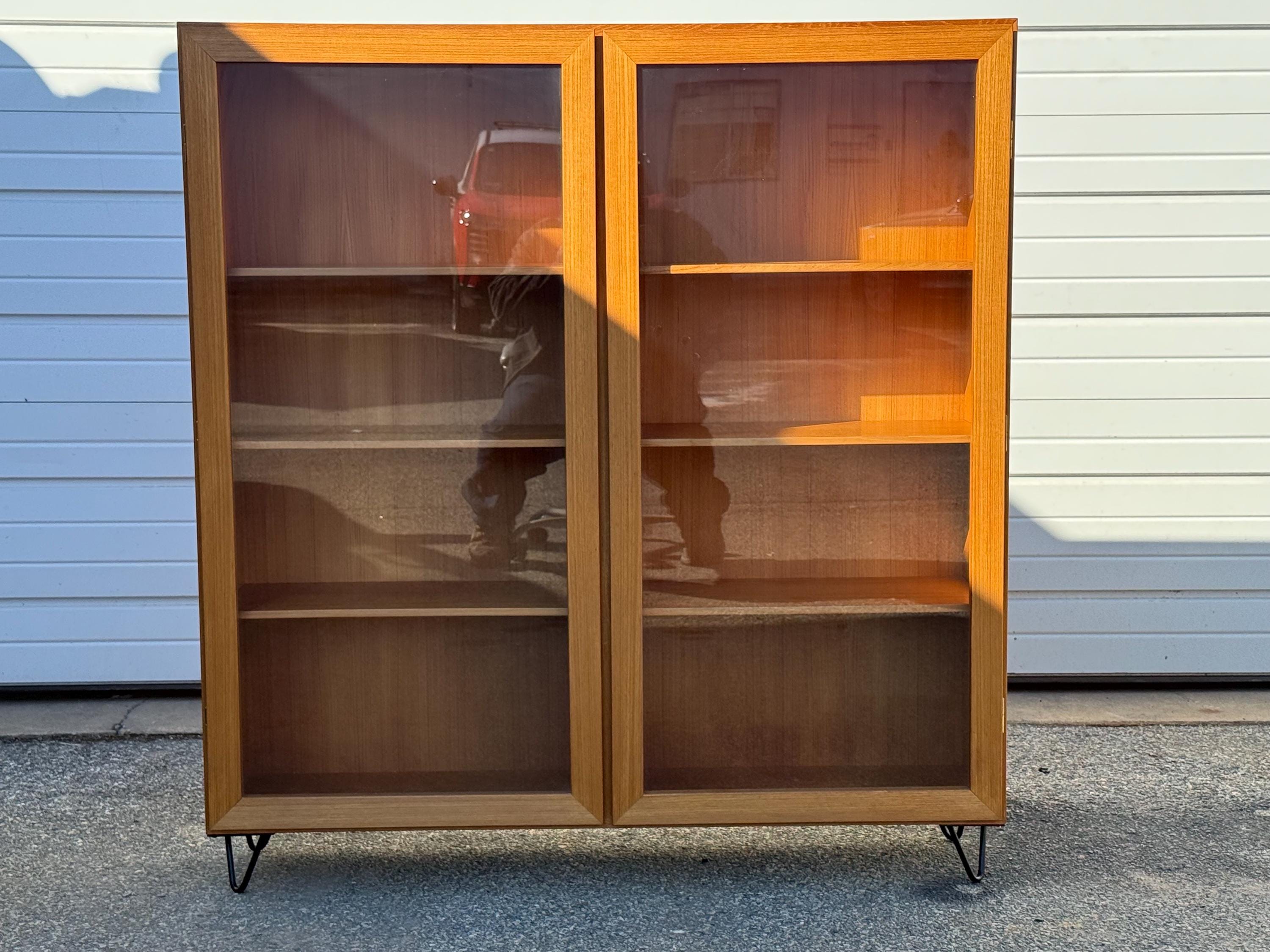 Offered is a Mid Century Danish Modern Teak 2 Door Bookcase. It has two separate shelving sections. It features two glass doors and each side has four shelves for efficiency. This is a highly versatile piece which offers ample storage and has great look. It is structurally sound with some minor fading and scratches in the wood. It has some age wear. It is made of teak wood. The bookcase is on hairpin legs. We have two units available. Review photos carefully and message us for additional info. It is not signed. See our other listings for more vintage finds!