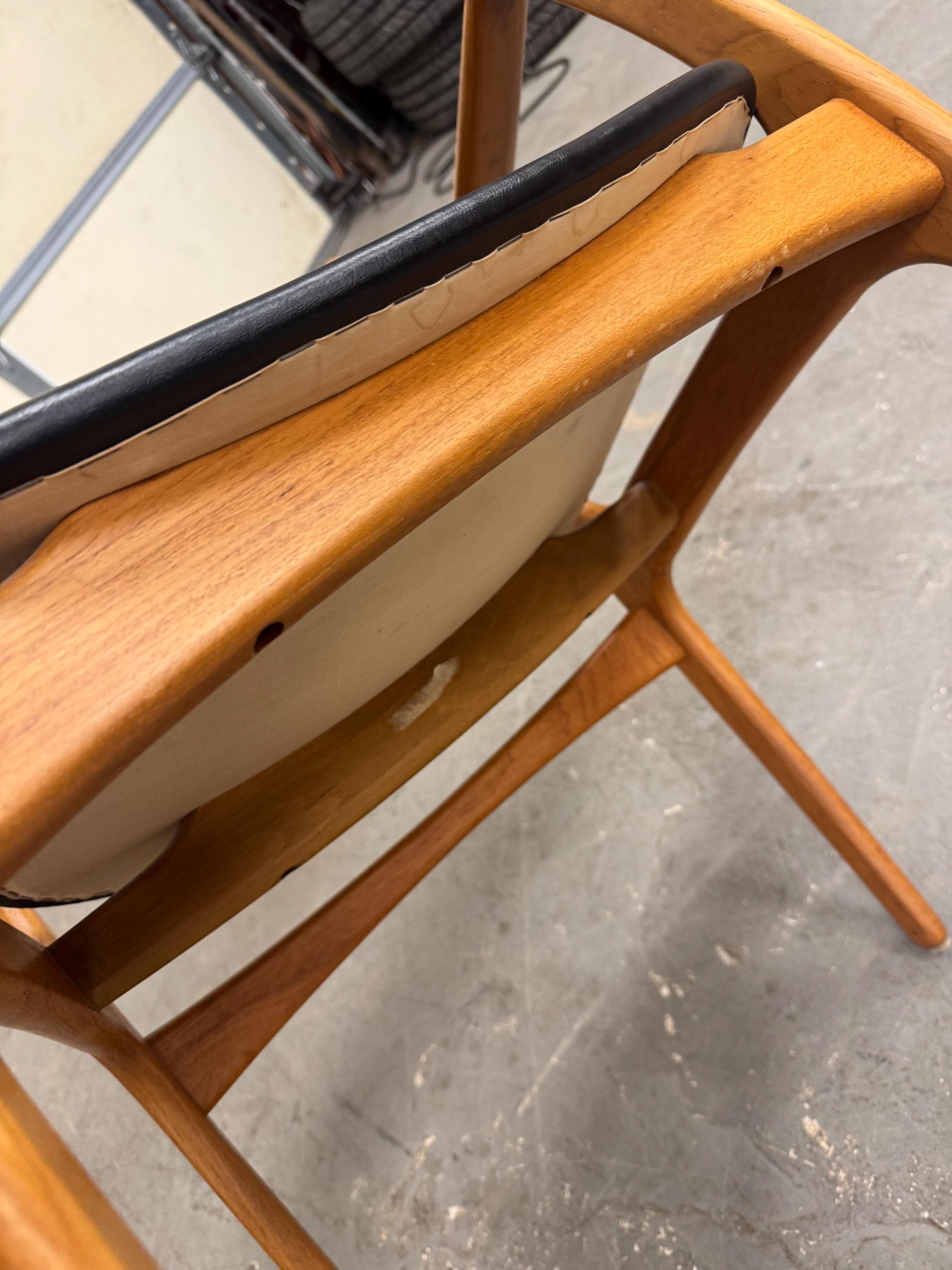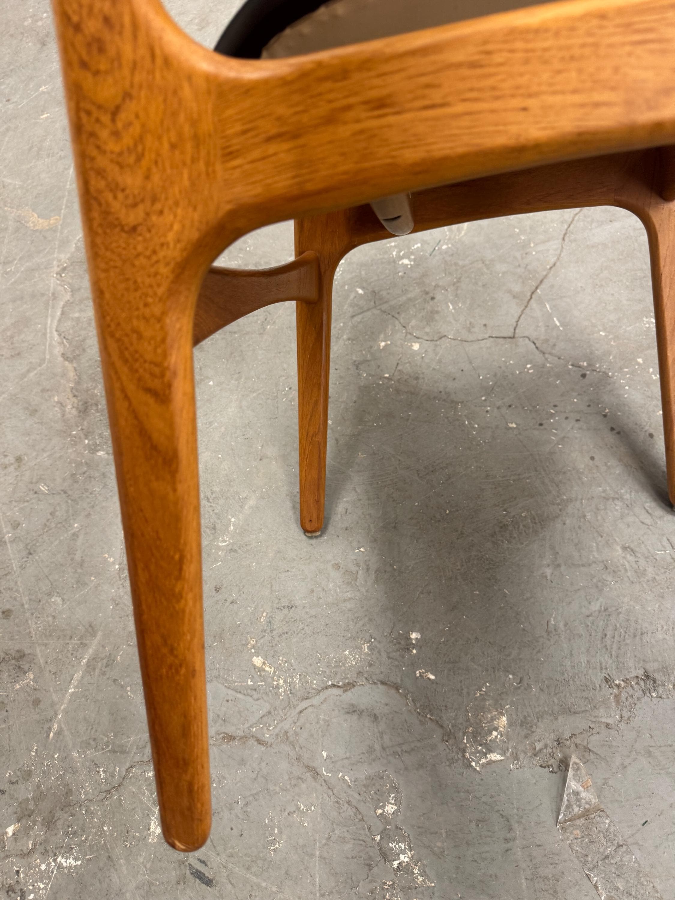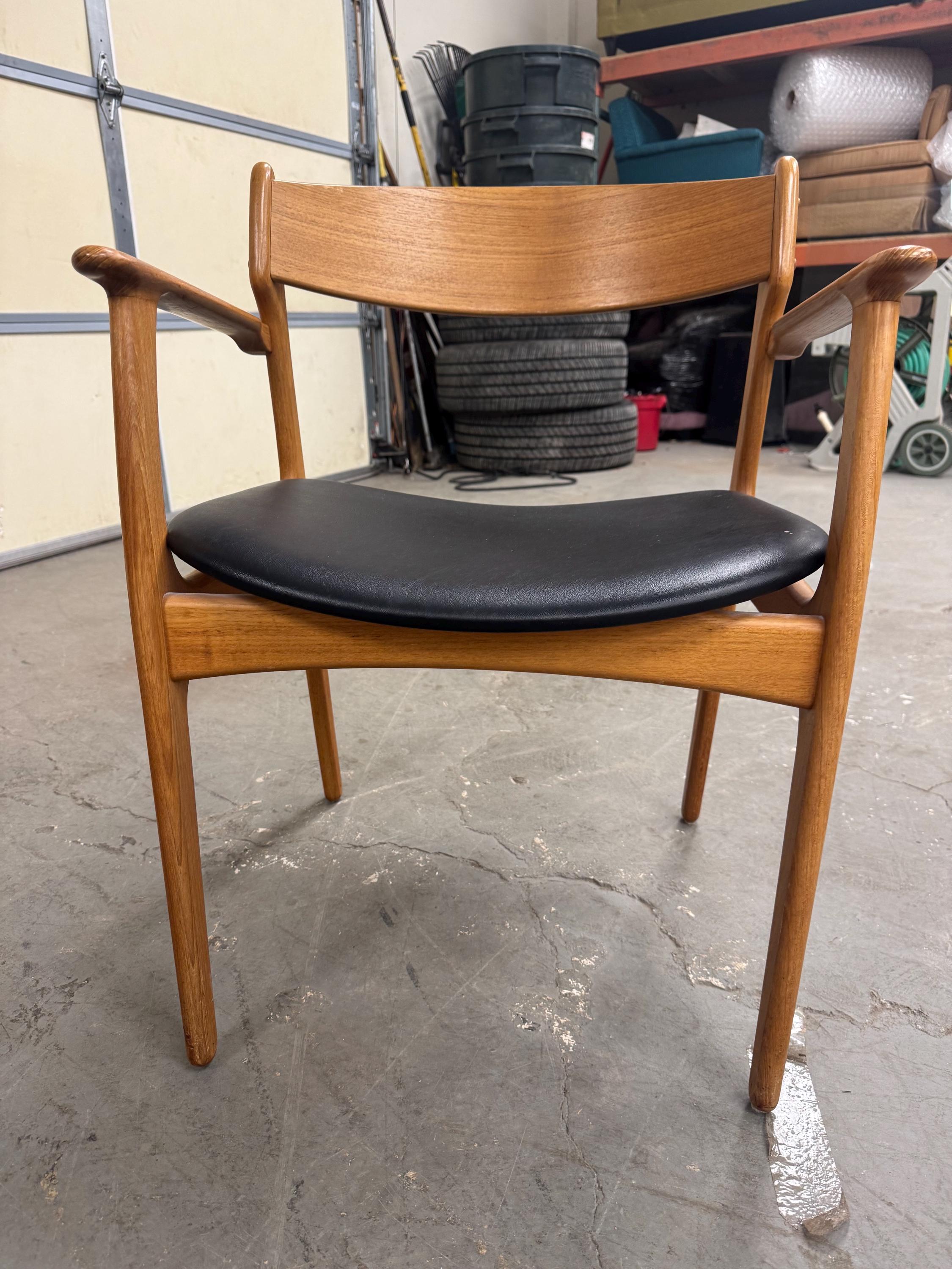 Offered is a Pair of Mid-Century Danish Teak Dining Arm Chairs by Erik Buch. This set was designed by Erik Buch for O.D Mobler-Oddense Maskinsnedkeri). The set represents Erik Buch's key style elements- The illusion of floating seats. The set will complete any dining area or design project. The set is 2 arm chairs -offered separately 6 sides . The chairs are in good condition, show normal age wear (sun fade, wear and tear on upholstery, surface scratches, --see pictures). They are not signed, but the sides chairs are. A great set to add to your home. These came out of a local estate along with one matching side chair in a separate listing. See our other listings for more great finds!