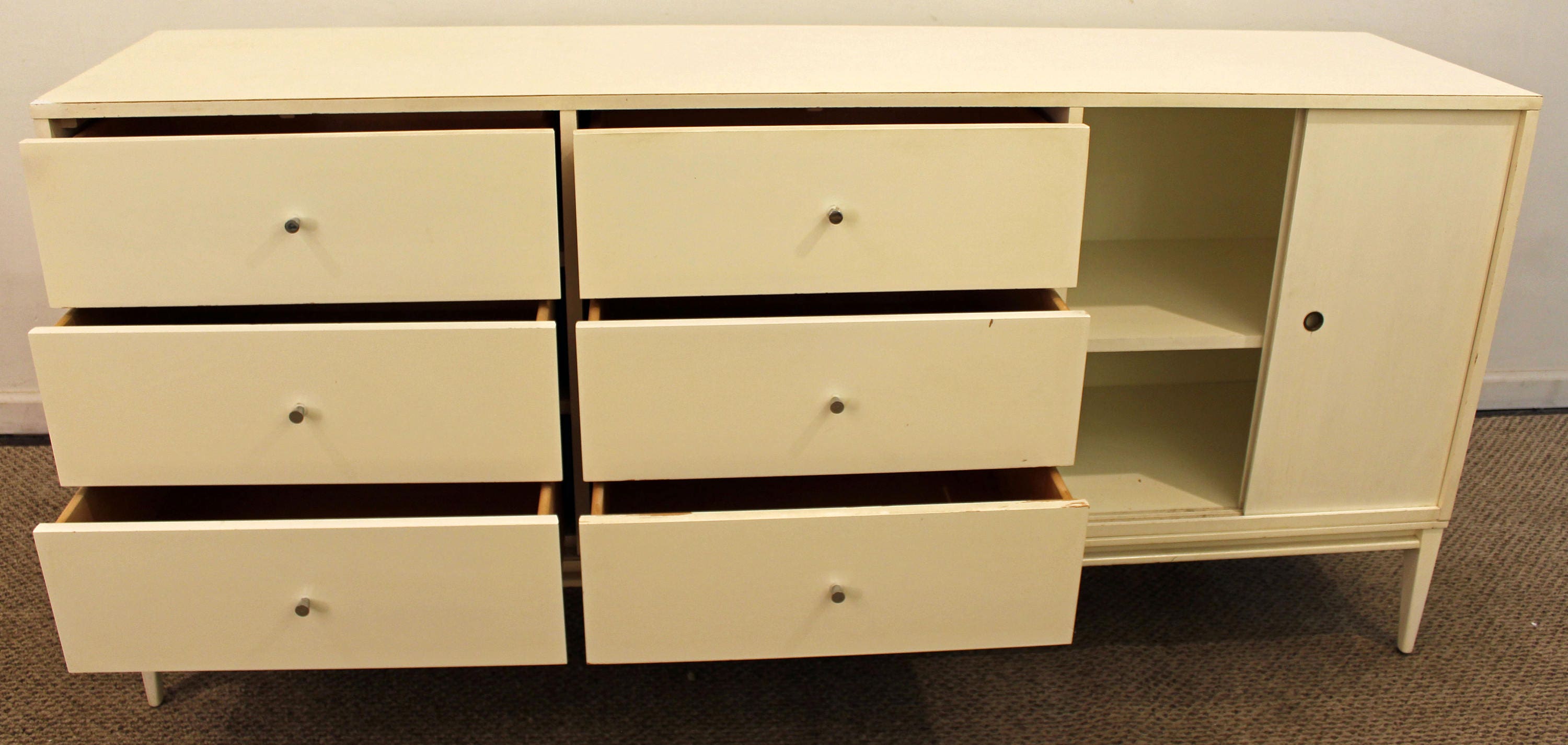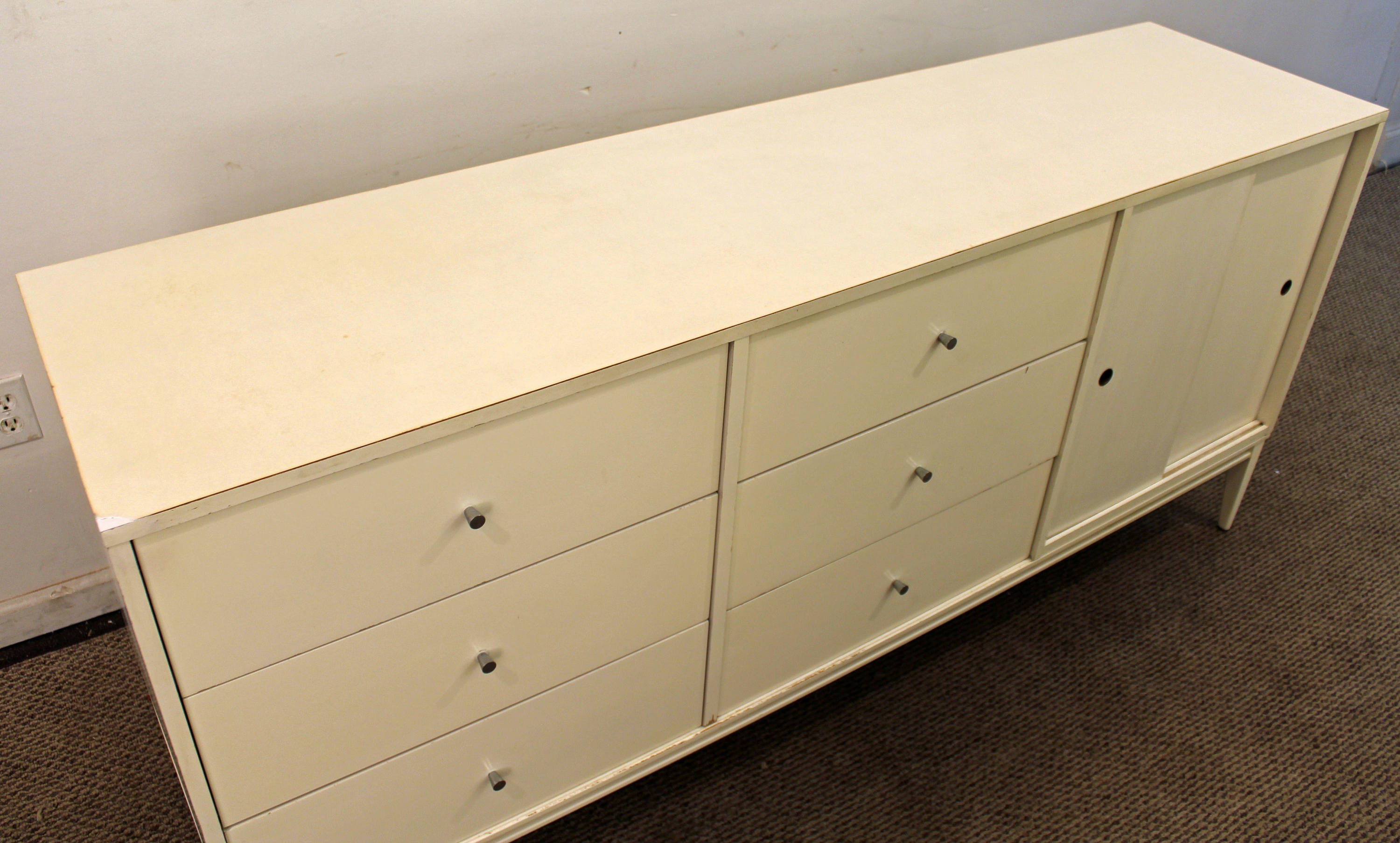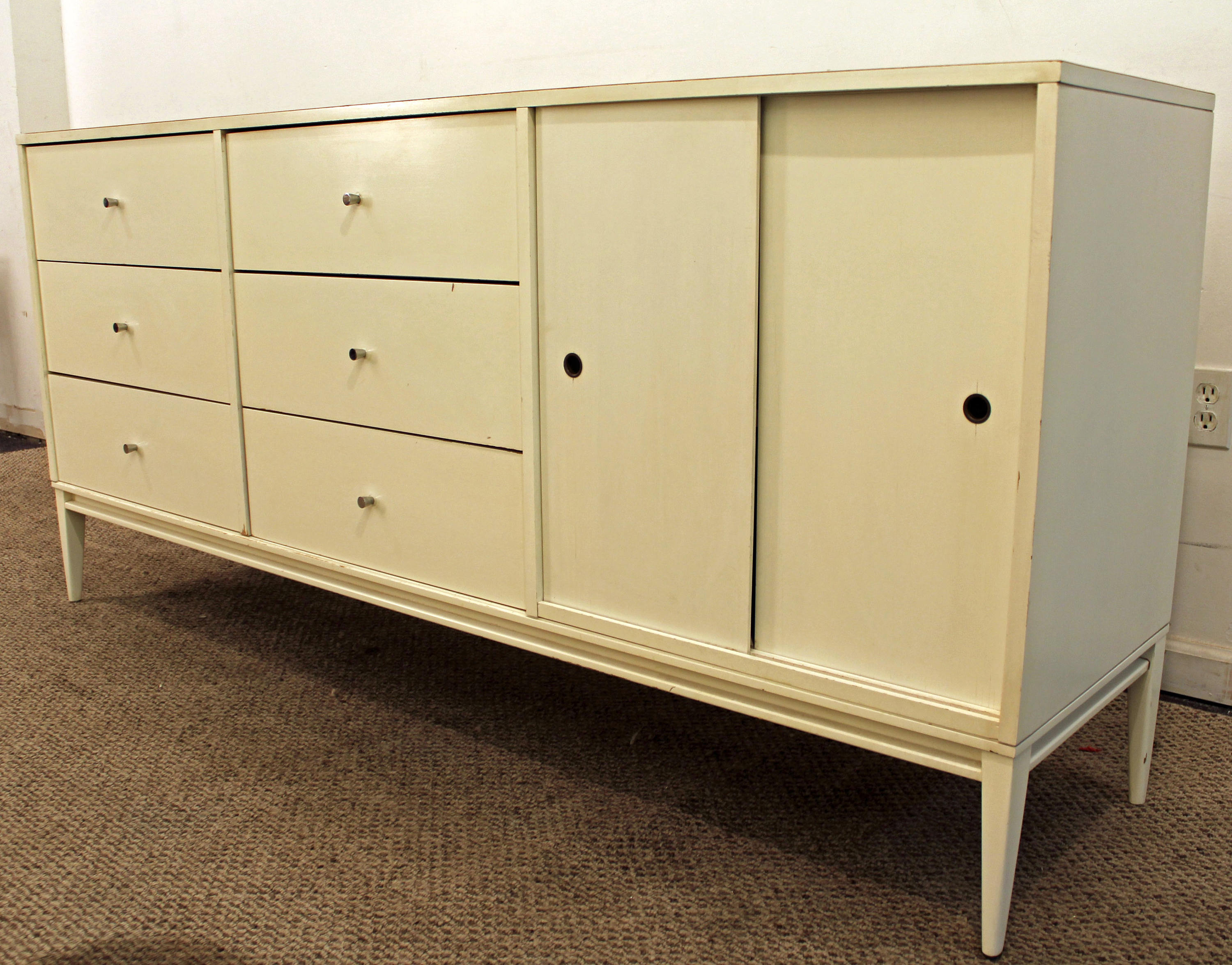 Offered is a very cool Mid-Century Danish Modern White Paul McCobb Planner Group Credenza. The credenza looks like it came right out of the mid-century modern period. It has 6 drawers and 2 sliding doors with shelving inside. It is in good condition, showing some wear (surface scratches/chips in veneer, minor stains, edge wear on paint, age wear-see pictures). It is marked by Paul McCobb for The Planner Group. We have a matching chair, nightstand, desk, dresser, headboard, and mirror in our other listings. This piece came out of a local estate. See the rest of our listings for more great finds!