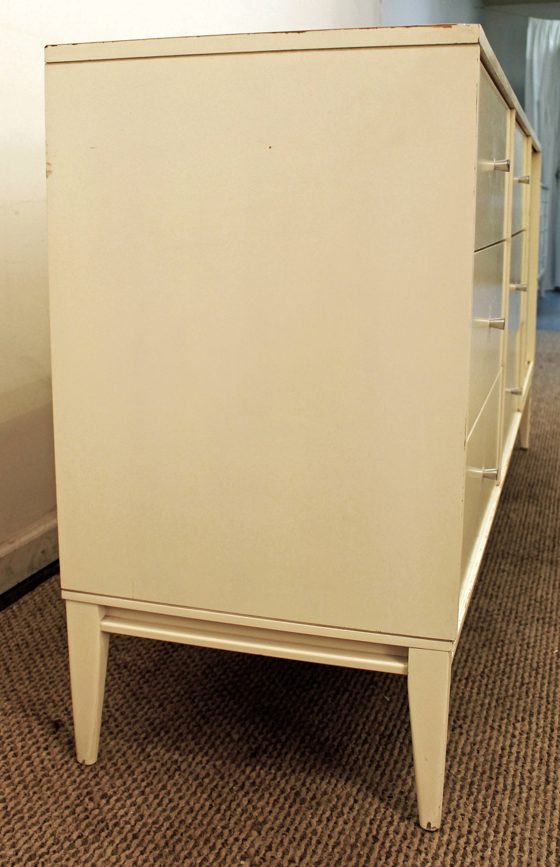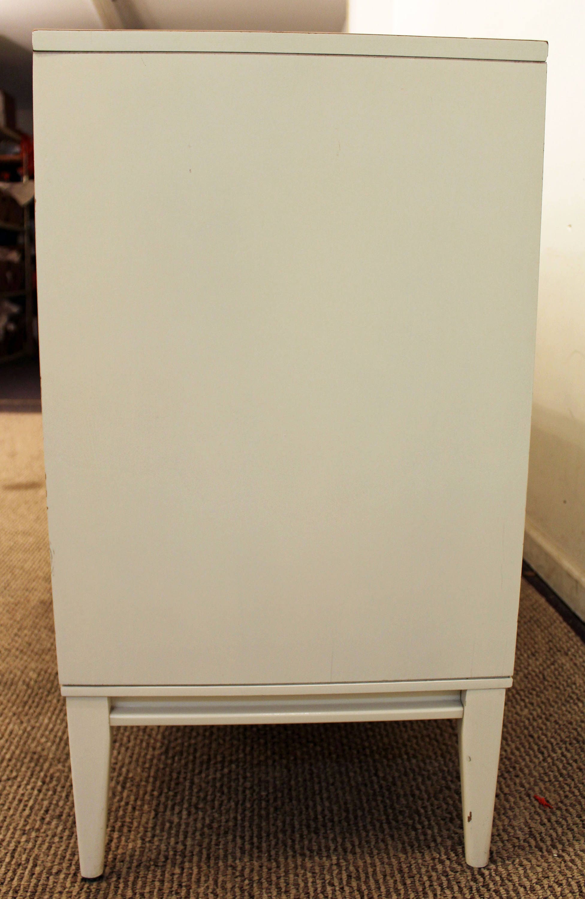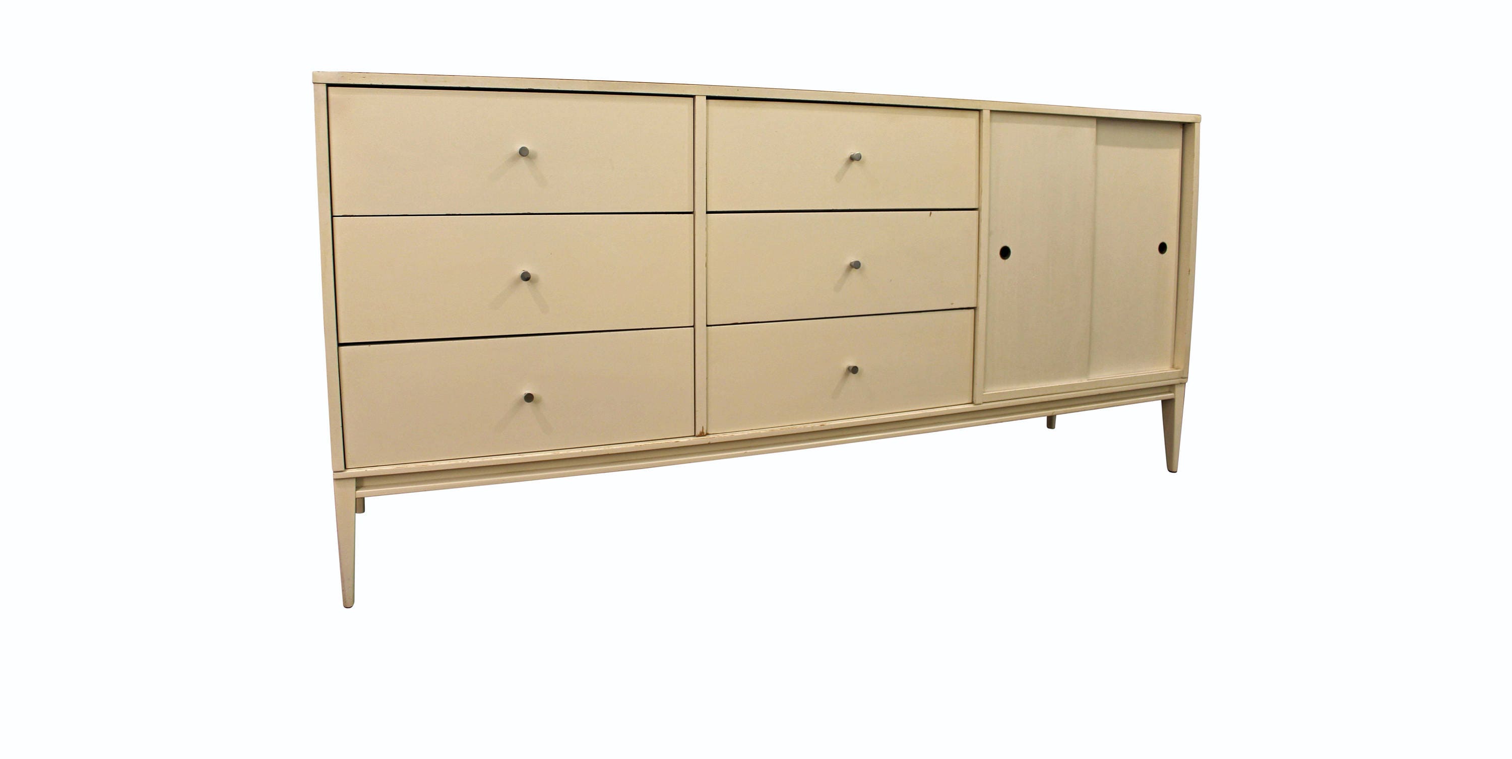Offered is a very cool Mid-Century Danish Modern White Paul McCobb Planner Group Credenza. The credenza looks like it came right out of the mid-century modern period. It has 6 drawers and 2 sliding doors with shelving inside. It is in good condition, showing some wear (surface scratches/chips in veneer, minor stains, edge wear on paint, age wear-see pictures). It is marked by Paul McCobb for The Planner Group. We have a matching chair, nightstand, desk, dresser, headboard, and mirror in our other listings. This piece came out of a local estate. See the rest of our listings for more great finds!
