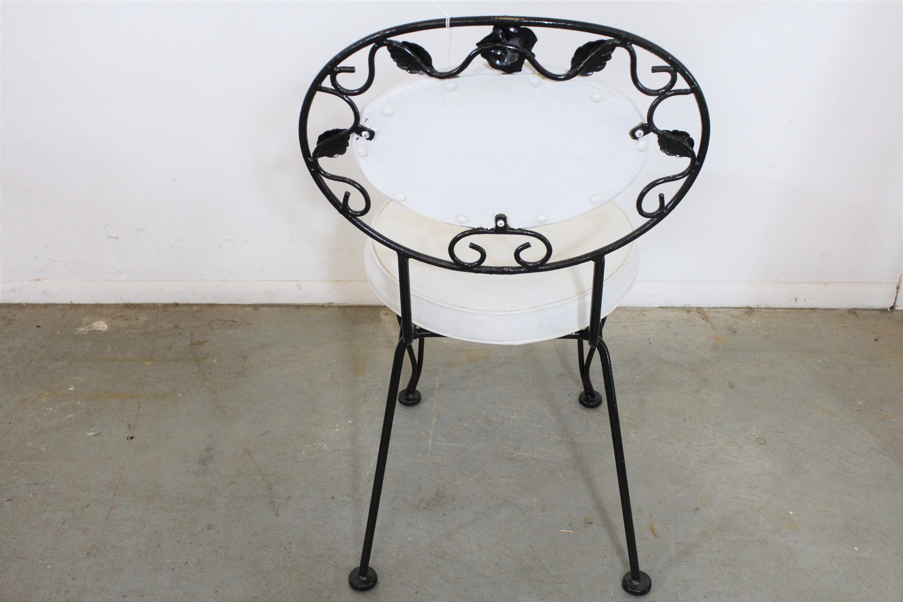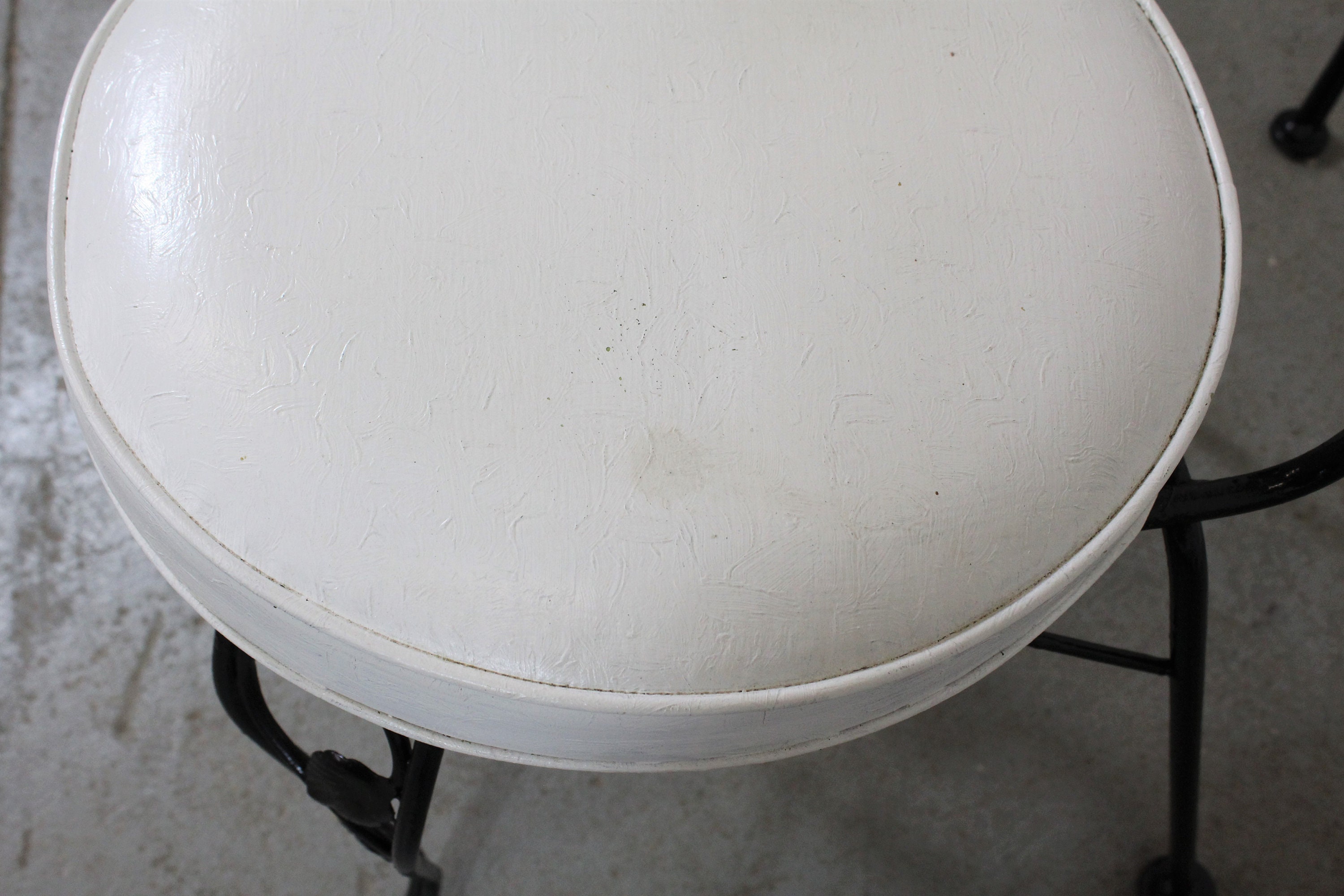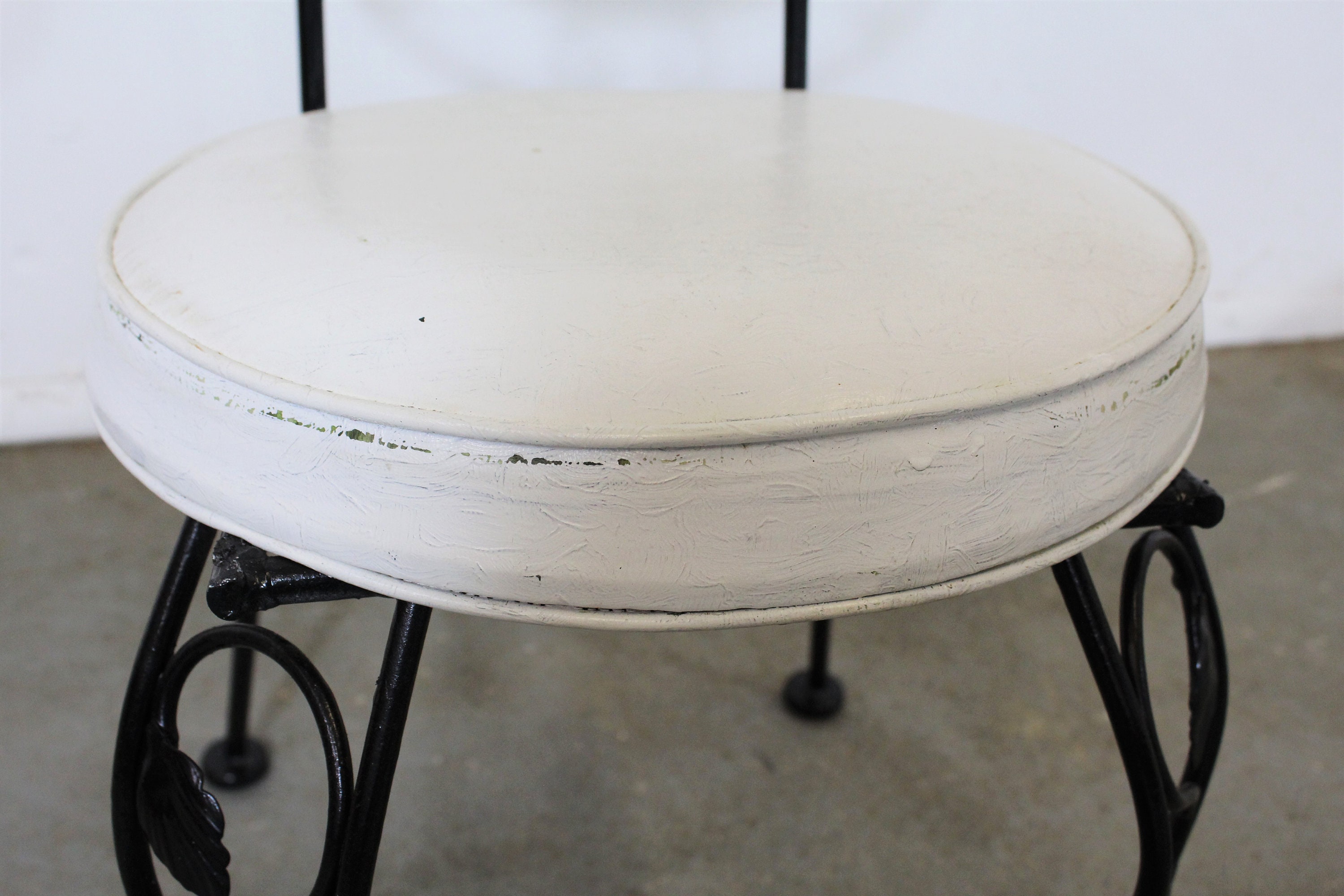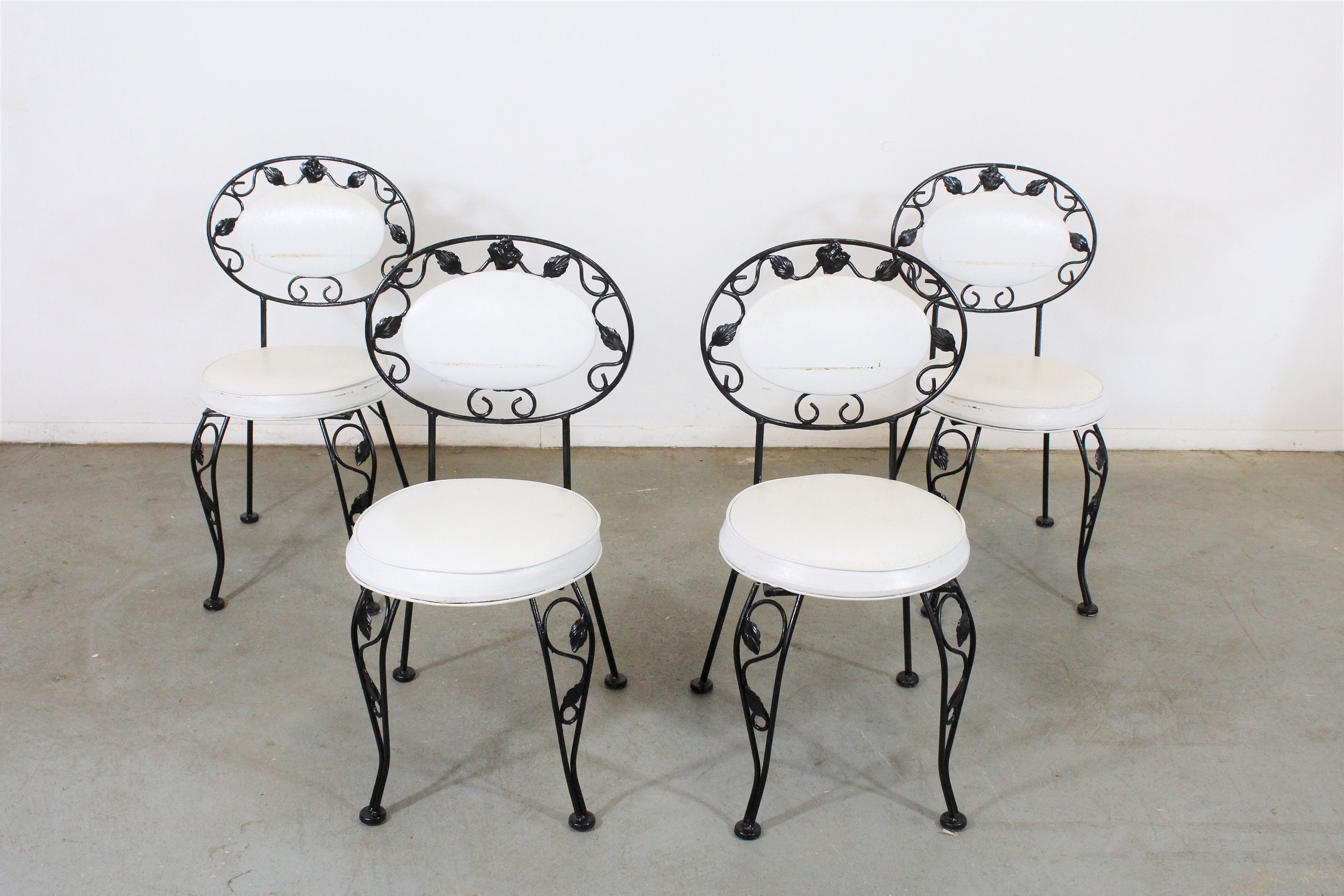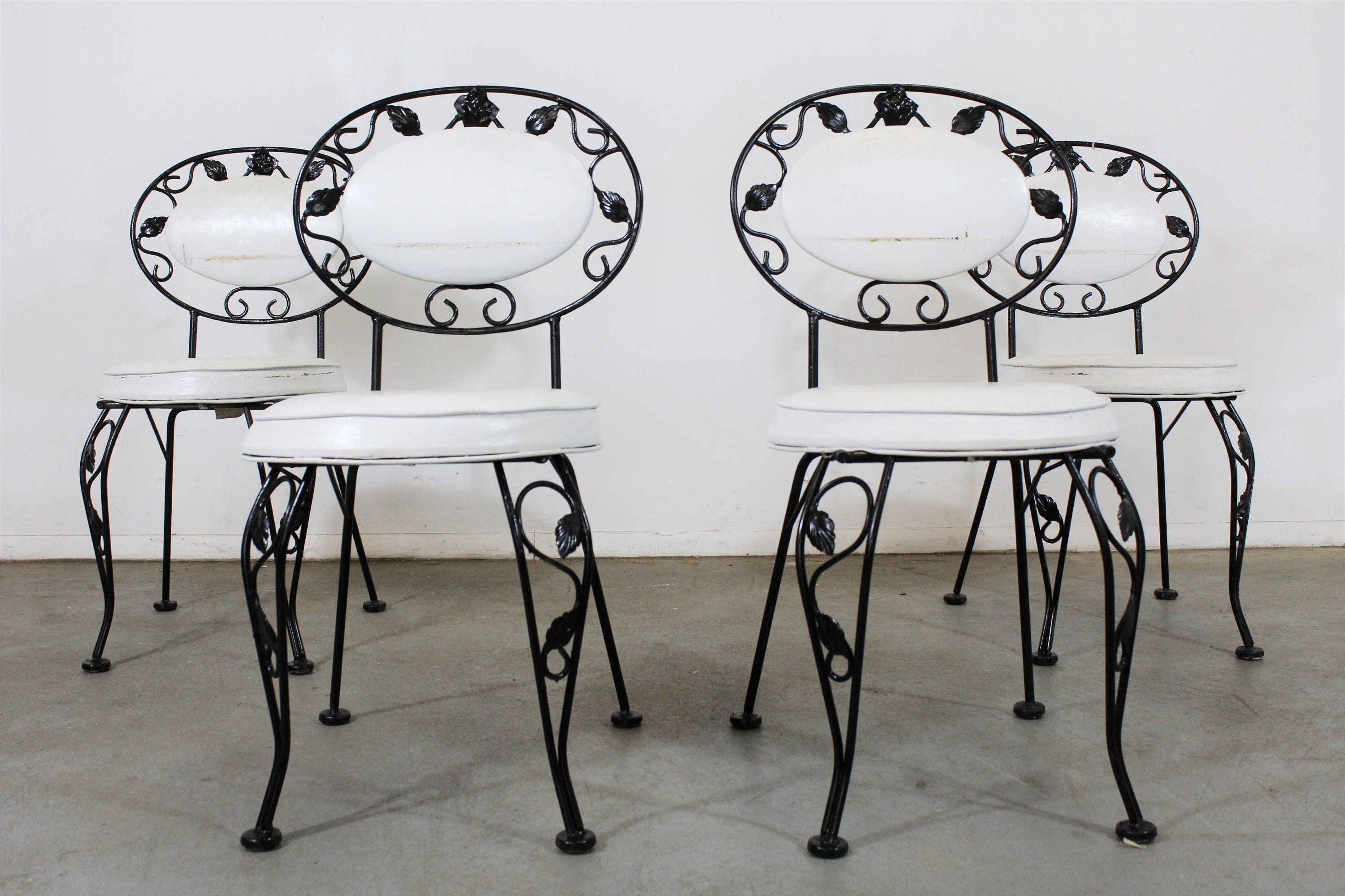 What a find. Offered is a set of 4 vintage Meadowcraft wrought iron patio side chairs with floral designs on the backs, curved legs, and vinyl seats.The chairs are in good condition with some age wear. The vinyl seats should be reupholstered due to the white paint. Please review pictures carefully and message us for any additional info. See our other listings for more amazing mid-century modern finds!
